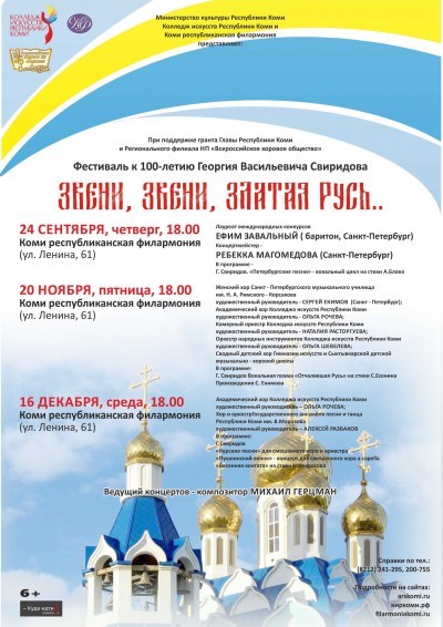 В год столетия великого музыканта Колледж искусств Республики Коми совместно с Коми республиканской филармонией и Региональным отделением Всероссийского хорового общества представили фестиваль вокальной и хоровой музыки, посвященный Георгию Свиридову. Названием проекту послужила строка из стихотворения Сергея Есенина, положенного на музыку Георгием Свиридовым – «Звени, звени, златая Русь…» И это не случайный выбор: до последнего дня своей жизни Георгий Васильевич воспевал свою страну, в самые трудные времена, оставаясь искренним патриотом России. В одном из интервью он так определил собственную композиторскую миссию: «Воспеть Русь, где Господь дал и велел мне жить, радоваться и мучиться».